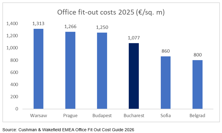 A full fit – out project in Bucharest, including all interior works across various specialties, building management systems (BMS), furniture, audio – video equipment, professional services (project management, health and safety coordination and site supervision), as well as contingency costs is being budgeted at an average of €1,077/ sq. m. Bucharest remains one of the most attractive options for companies opening, consolidating or relocating offices in the CEE region.